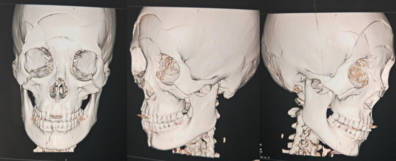 该患者转入口腔科后,李瑞春主任及主管医生蔺非非对患者的伤情进行了详细的检查。患者的三维CT显示为颌面部复杂骨折,需要进行全面部整复手术。这种手术创伤大、费用高,家属无法接受。考虑到患者外伤后的面容基本正常,仅牙合关系出现错乱。在与家属进行了沟通之后,李主任给患者实施了上颌骨Le Fort1型手术。术中对患者上颌骨进行截骨,把完全游离的上颌骨向前前牵引,恢复咬合功能,最后用钛板把截骨线再固定起来,手术过程非常顺利。