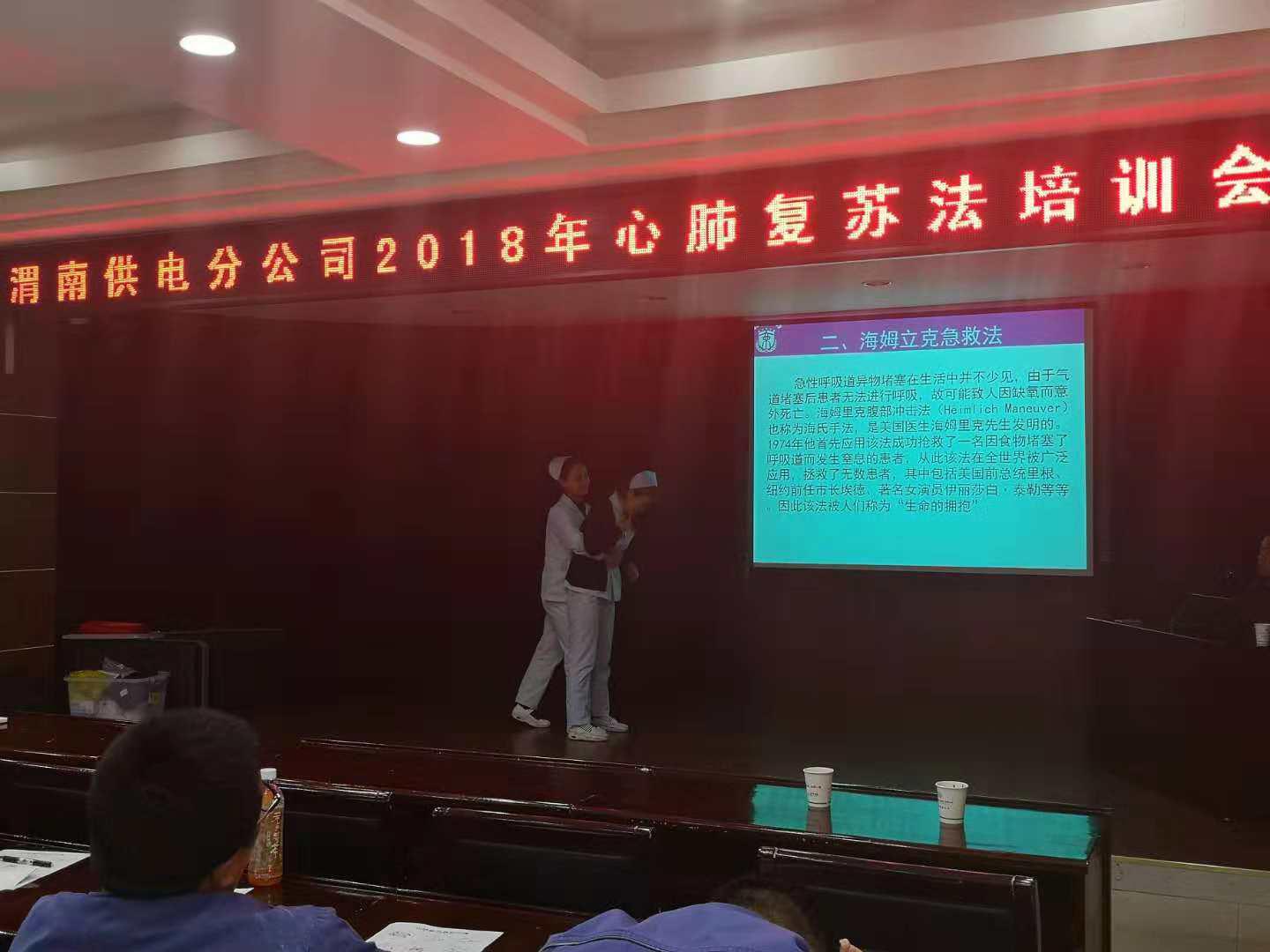 为了不断提高电力从业人员心肺复苏操作水平,加强员工应急救治能力,10月11-12日,开云在线登录急诊科副主任范华杰、张娟红护士长携3名护理骨干走进渭南市供电公司,再次开展了心肺复苏培训普及活动。