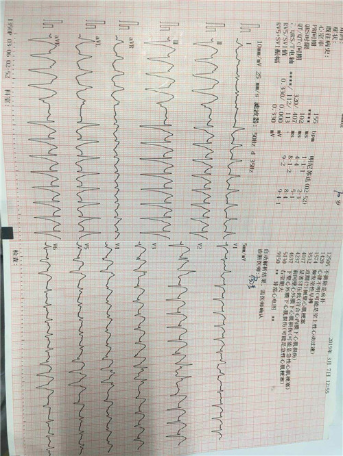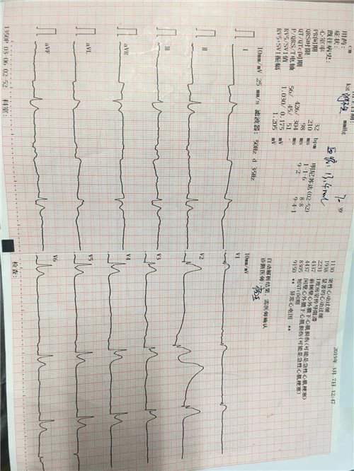 在对患者进行心电图、心脏B超检查时,发现患者大面积心肌梗塞,并且存在恶性心律失常。于是邢岳医师与户生信副主任医师及心内科医师共同商讨后,决定给患者实施静脉溶栓治疗,使梗塞的冠脉尽快开通、避免坏死的心肌面积增大。向家属谈明病情的凶险性及治疗过程中存在的相关潜在风险性,并征得家属同意后,由邢岳、杨玉医师在护理人员的配合下给予患者行静脉溶栓治疗。同时结合患者病情,给与呼吸机辅助呼吸等综合治疗。治疗后,患者生命体征逐渐恢复正常,意识转清。随后,择期行冠状动脉造影及治疗。