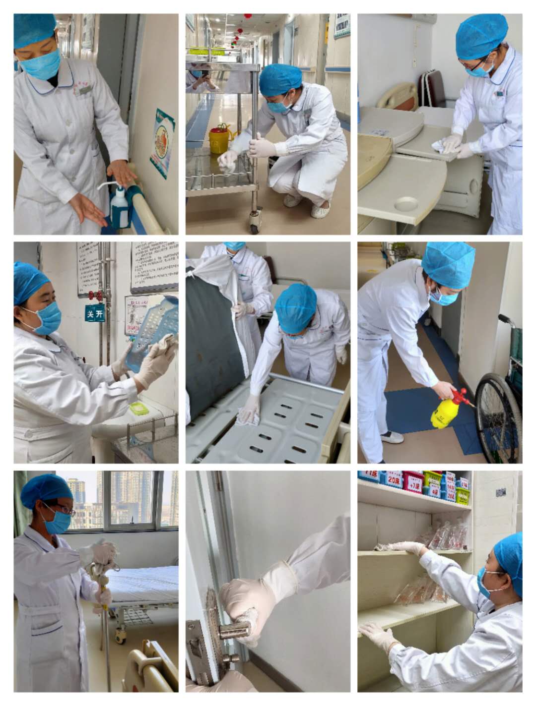 面对疫情,护士长立即调整班次,制度相关疫情管理制度,设立疫情排查岗、门禁班、新入院患者及家属信息登记表、科室出入人员登记表,严格落实测量体温、疫情相关信息排查,确保不漏一人。病区每天彻底清洁并消毒,防止交叉感染,确保患者安全。科室医护人员,以战斗的姿态纷纷报名请战。