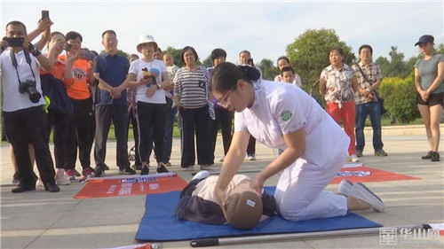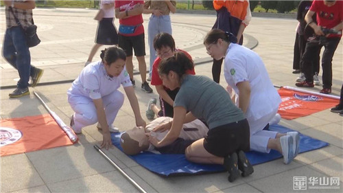 主题活动正式开始,“人人学急救,急救为人人”的横幅标语拉开,现场已准备好医用教具模拟人。产科的两名护士王楠、苗美婷,一人用话筒清晰讲解,一人给大家做标准示范。现场群众热情积极,踊跃报名,一一上前练习。两位美小护耐心给大家纠正动作,指导练习。很多晨练的人们纷纷围过来观看学习。几位练习完的朋友们都说:“学会了这项技能,说不定啥时就可能派上用场,救人一命胜造七级浮屠呢!”广场上观众练习完后,几位阿姨告诉闻讯赶来全程摄像的渭南电视台记者说:“这样的活动真的非常好,我们学到的急救知识很实用。感谢产科的医护人员,她们很辛苦。”