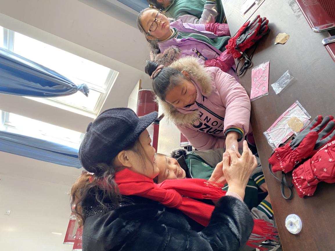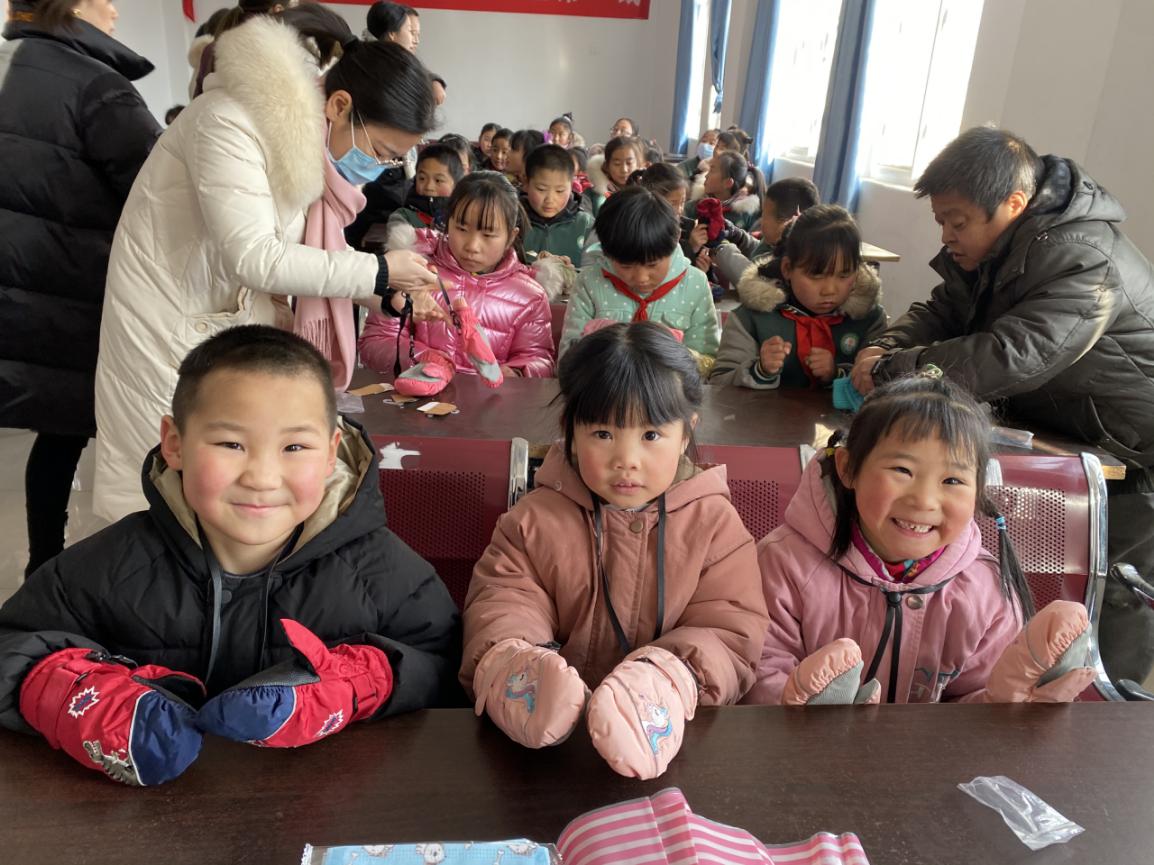 孩子们欣喜地带着手套,那一张张扬起的笑脸,融化了在场每个人的心。